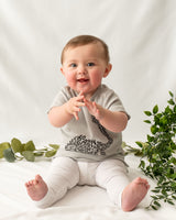 Roar with dinosaur !  Softly made from 100% GOTS certified organic cotton, our dinosaur short sleeve Tee keeps your baby boy cool and dry. Featuring a baby dinosaur printed with letter “ ROAR “ at the front,  snap bottoms on the left shoulder for easy dressing.