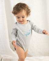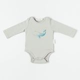 Whales are among the very few animals can roam throughout all of the world's oceans. This whale bodysuit is designed to cherish the free spirit and true wildness of the tiny little heart. Featuring a blue hand-drawn whale at the front, envelope neckline and snap buttons at the bottom.