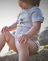 Featuring a hand-drawn pineapple at the front, this short sleeve bodysuit is made for effortless everyday dressing all year around.  Snap buttons on the left shoulder and the bottom for easy dressing and nappy changing.