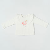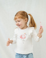 Featuring a hand-drawn pink flamingo at the center front, snap button at the back for easy dressing, ruffled shoulders and cuffs for a feminism look. A perfect toddlers' everyday essential for all year around.