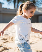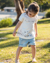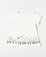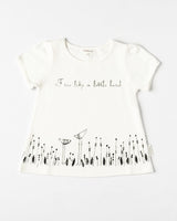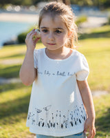 Our beautifully designed natural white A-Line short sleeve T-shirt features a hand-drawn grass garden that goes around from front to back, with a playful slogan “ Free like a Little Bird “ printed on the chest. Gathered sleeves give the extra cuteness and sweetness. This A Line Tee makes a perfect all-year-around essential piece. Matching it with a legging or denim for a classic yet fresh look.